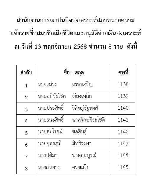 สำนักงานการฌาปนกิจสงเคราะห์สภาทนายความ แจ้งรายชื่อสมาชิกเสียชีวิตและอนุมัติจ่ายเงินสงเคราะห์ ณ วันที่ 13 พฤศจิกายน 2568 14/11/2025Peerapongข่าวการฌาปนกิจสงเคราะห์ สำนักงานการฌาปนกิจสงเคราะห์สภาทนายความ แจ้งรายชื่อสมาชิกเสียชีวิตและอนุมัติจ่ายเงินสงเคราะห์ ณ วันที่ 13 พฤศจิกายน 2568 FacebookFacebookXXLINELine