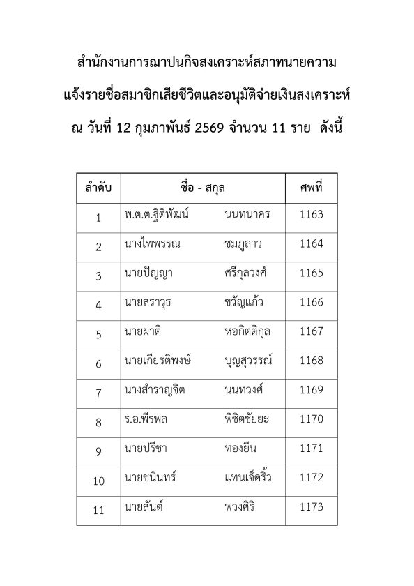 สำนักงานการฌาปนกิจสงเคราะห์สภาทนายความ แจ้งรายชื่อสมาชิกเสียชีวิตและอนุมัติจ่ายเงินสงเคราะห์ ณ วันที่ 12 กุมภาพันธ์ 2569 13/02/2026Peerapongข่าวการฌาปนกิจสงเคราะห์ สำนักงานการฌาปนกิจสงเคราะห์สภาทนายความ แจ้งรายชื่อสมาชิกเสียชีวิตและอนุมัติจ่ายเงินสงเคราะห์ ณ วันที่ 12 กุมภาพันธ์ 2569 FacebookFacebookXXLINELine