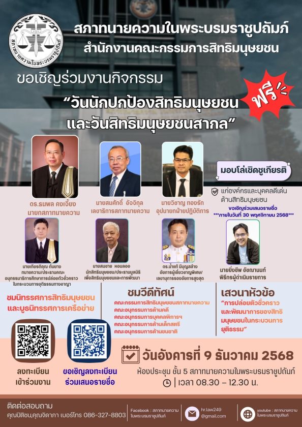ขอเชิญร่วมงานกิจกรรมวันนักปกป้องสิทธิมนุษยชนและวันสิทธิมนุษยชนสากล 25/11/2025Peerapongข่าวประชาสัมพันธ์ สำนักงานคณะกรรมการสิทธิมนุษยชน สภาทนายความในพระบรมราชูปถัมภ์ ขอเชิญร่วมเสนอรายชื่อทนายความ นักปกป้องสิทธิมนุษยชน หรือองค์กรที่มีผลงานด้านสิทธิมนุษยชน ดีเด่น ใน “กิจกรรมวันนักปกป้องสิทธิมนุษยชนและวันสิทธิมนุษยชนสากล” เสนอรายชื่อทนายความด้านสิทธิมนุษยชนดีเด่น ผลงานดีเด่นด้านสิทธิมนุษยชน เสนอรายชื่อนักปกป้องสิทธิมนุษยชนดีเด่น ผลงานดีเด่นด้านสิทธิมนุษยชน เสนอรายชื่อองค์กรที่มีผลงานด้านสิทธิมนุษยชนดีเด่น ผลงานดีเด่นด้านสิทธิมนุษยชน วันอังคารที่ 9 ธันวาคม 2568 เวลา 08.30 – 12.30 น. ณ ห้องประชุม ชั้น 5 สภาทนายความในพระบรมราชูปถัมภ์ ติดต่อสอบถาม : คุณปิติชน,คุณจิดาภา เบอร์โทร 086-327-8803 ลงทะเบียน : Click FacebookFacebookXXLINELine