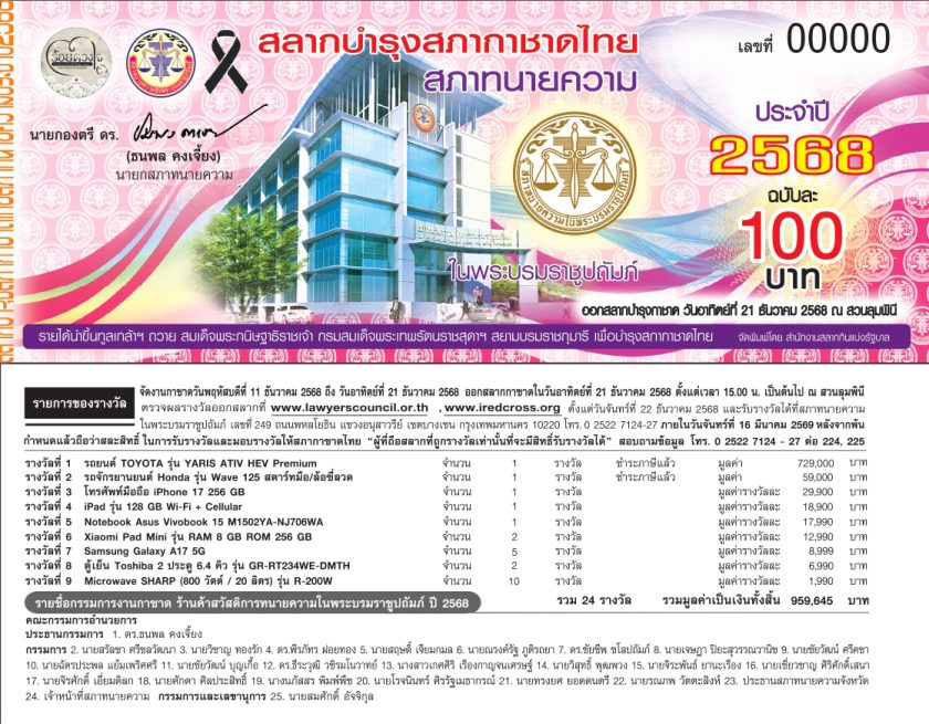 โดยรางวัลสลากกาชาดสภาทนายความ ประจำปี 2568 มีดังนี้