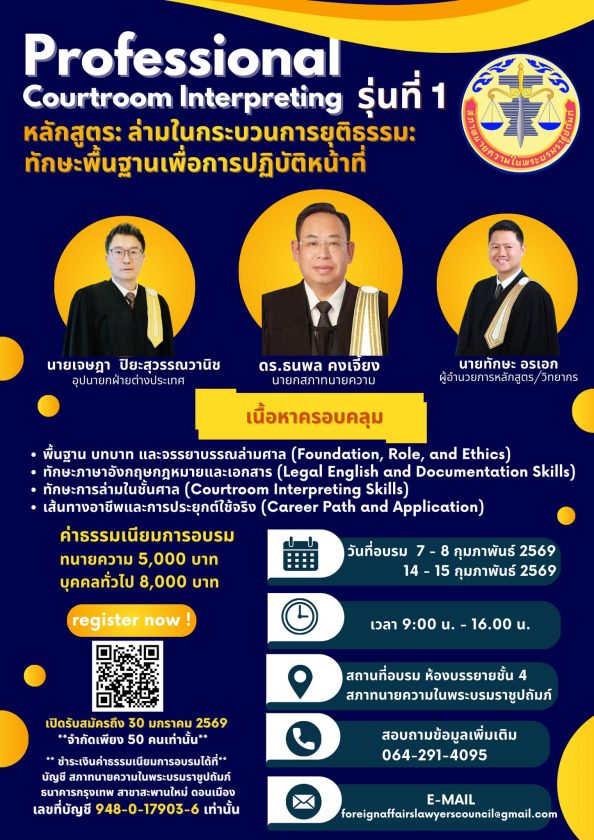 สภาทนายความเปิดรับสมัครอบรม Professional Courtroom Interpreting รุ่นที่ 1 หลักสูตร: ล่ามในกระบวนการยุติธรรม: ทักษะพื้นฐานเพื่อการปฏิบัติหน้าที่