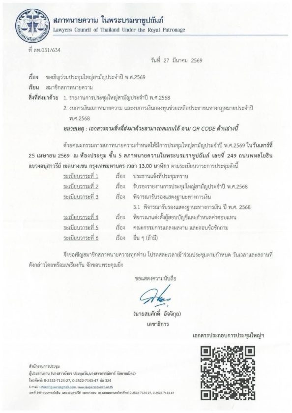 ขอเชิญสมาชิกสภาทนายความร่วมประชุมใหญ่สามัญประจำปี พ.ศ. 2569