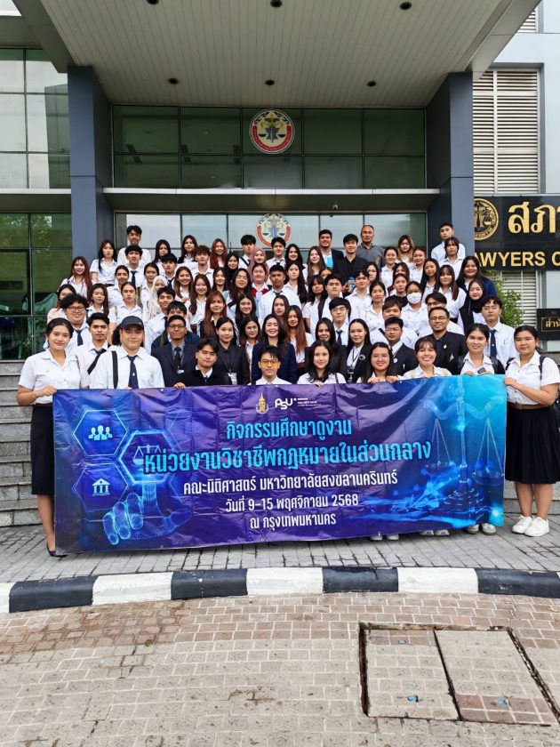 เมื่อวันที่ 10 พฤศจิกายน 2568 เวลา 13.30 – 16.00 น. คณาจารย์และนักศึกษา คณะนิติศาสตร์ มหาวิทยาลัยสงขลานครินทร์ (ม.อ.) วิทยาเขตหาดใหญ่ ชั้นปีที่ 2 จำนวนรวม 85 คน ได้เดินทางมาศึกษาดูงาน ณ สภาทนายความในพระบรมราชูปถัมภ์ กรุงเทพมหานคร