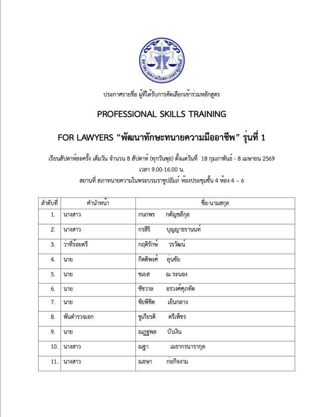 ประกาศผลผู้ผ่านการคัดเลือกหลักสูตร “Professional Skills Training for Lawyers พัฒนาทักษะทนายความมืออาชีพ รุ่นที่ 1”