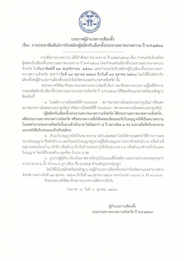 ประกาศผู้อำนวยการเลือกตั้ง เรื่อง การประชาสัมพันธ์การรับสมัครผู้สมัครรับเลือกตั้งประธานสภาทนายความ ปี พ.ศ.2568 06/10/2025Peerapongข่าวสภาทนายความ ประกาศผู้อำนวยการเลือกตั้ง เรื่อง การประชาสัมพันธ์การรับสมัครผู้สมัครรับเลือกตั้งประธานสภาทนายความ ปี พ.ศ.2568 ดาวน์โหลดใบสมัครรับเลือกตั้งเป็นประธานสภาทนายความจังหวัด : Download FacebookFacebookXXLINELine