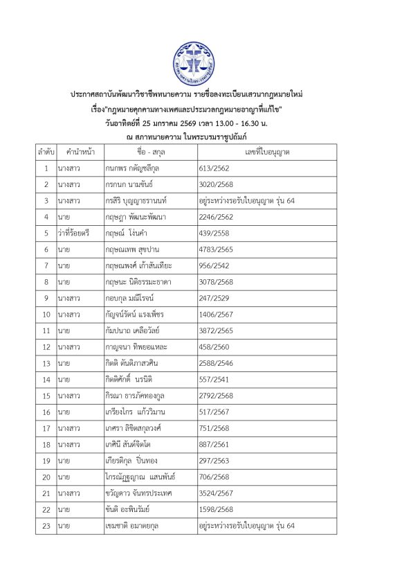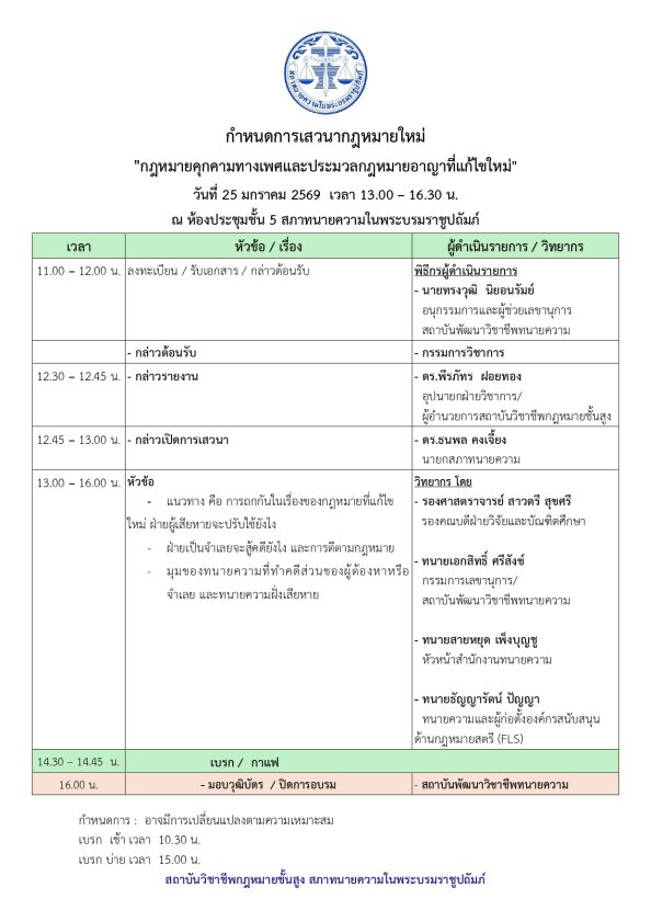 ประกาศรายชื่อผู้เข้าร่วมเสวนากฎหมายใหม่ “กฎหมายคุกคามทางเพศและประมวลกฎหมายอาญาที่แก้ไขใหม่” 21/01/2026Peerapongข่าวสภาทนายความ ประกาศรายชื่อผู้เข้าร่วมเสวนากฎหมายใหม่ “กฎหมายคุกคามทางเพศและประมวลกฎหมายอาญาที่แก้ไขใหม่” วันที่ 25 มกราคม 2569 เวลา 13.00 – 16.30 น. ณ ห้องประชุมชั้น 5 สภาทนายความในพระบรมราชูปถัมภ์ FacebookFacebookXXLINELine