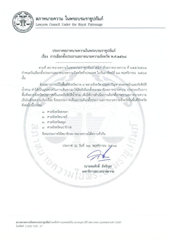 ประกาศสภาทนายความในพระบรมราชูปถัมภ์ เรื่อง การเลือกตั้งประธานสภาทนายความจังหวัด พ.ศ.2568 23/11/2025Peerapongข่าวสภาทนายความ ประกาศสภาทนายความในพระบรมราชูปถัมภ์ เรื่อง การเลือกตั้งประธานสภาทนายความจังหวัด พ.ศ.2568 FacebookFacebookXXLINELine
