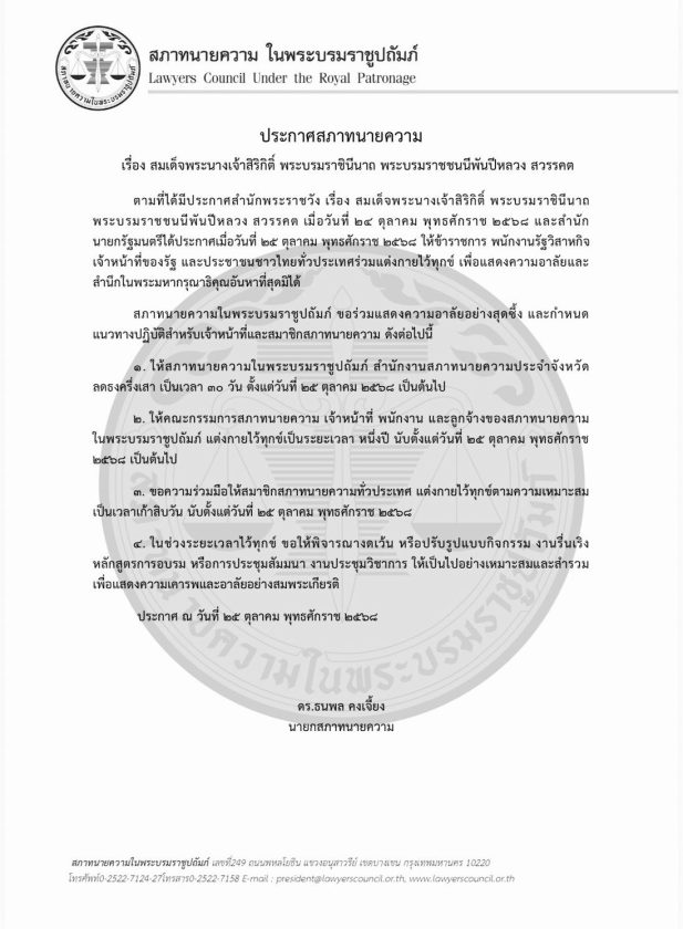 ประกาศสภาทนายความ เรื่อง สมเด็จพระนางเจ้าสิริกิติ์ พระบรมราชินีนาถ พระบรมราชชนนีพันปีหลวง สวรรคต 26/10/2025Peerapongข่าวสภาทนายความ ประกาศสภาทนายความ เรื่อง สมเด็จพระนางเจ้าสิริกิติ์ พระบรมราชินีนาถ พระบรมราชชนนีพันปีหลวง สวรรคต FacebookFacebookXXLINELine