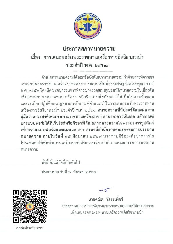 ประกาศสภาทนายความ เรื่อง การเสนอขอรับพระราชทานเครื่องราชอิสริยาภรณ์ฯ ประจำปี 2569 06/03/2026Peerapongข่าวสภาทนายความ ประกาศสภาทนายความ เรื่อง การเสนอขอรับพระราชทานเครื่องราชอิสริยาภรณ์ฯ ประจำปี 2569 ดาวน์โหลดแบบฟอร์ม : Download FacebookFacebookXXLINELine