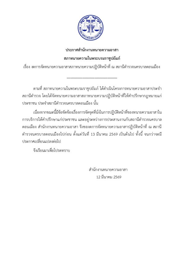 ประกาศสำนักงานทนายความอาสา สภาทนายความในพระบรมราชูปถัมภ์ เรื่อง งดการจัดทนายความอาสาสภาทนายความปฏิบัติหน้าที่ ณ สถานีตำรวจนครบาลดอนเมือง 12/03/2026Peerapongข่าวสภาทนายความ ประกาศสำนักงานทนายความอาสา สภาทนายความในพระบรมราชูปถัมภ์ เรื่อง งดการจัดทนายความอาสาสภาทนายความปฏิบัติหน้าที่ ณ สถานีตำรวจนครบาลดอนเมือง FacebookFacebookXXLINELine