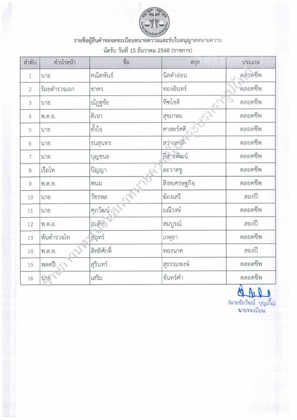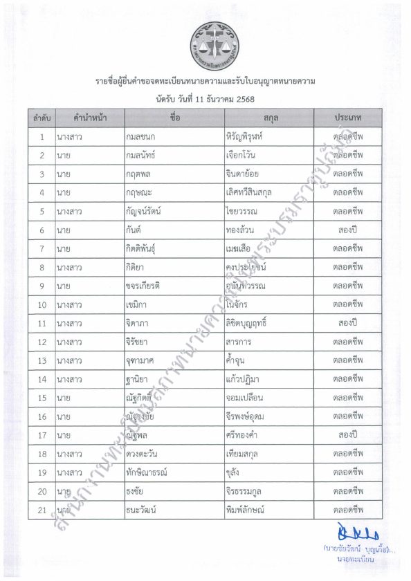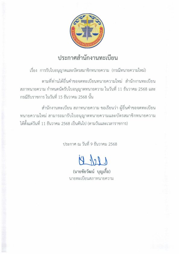 โดยประกาศรายชื่อผู้รับใบอนุญาตทนายความใหม่ นัดรับวันที่ 11 ธันวาคม 2568 และกรณีรับราชการ วันที่ 15 ธันวาคม 2568