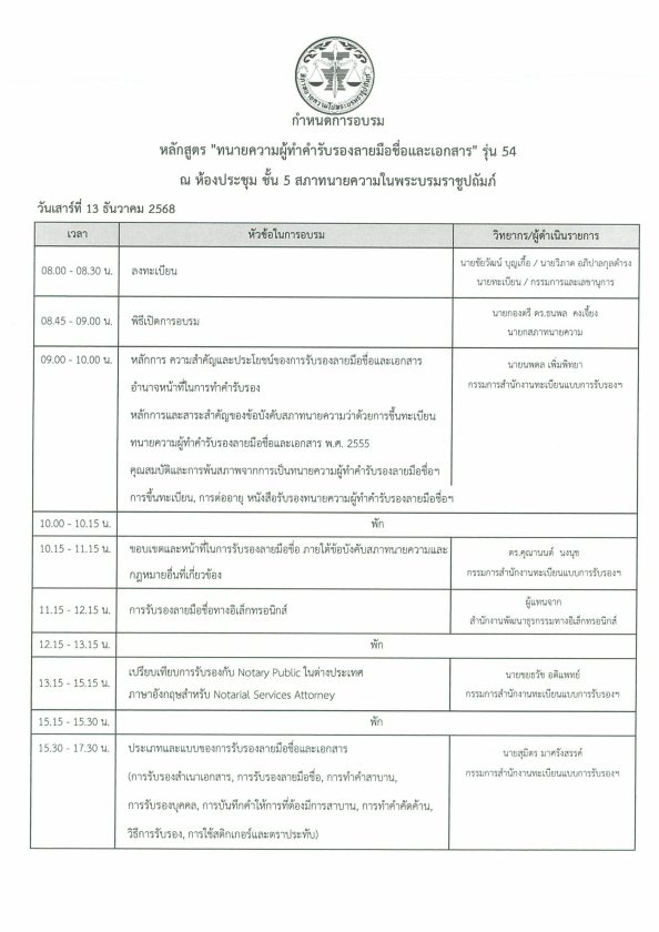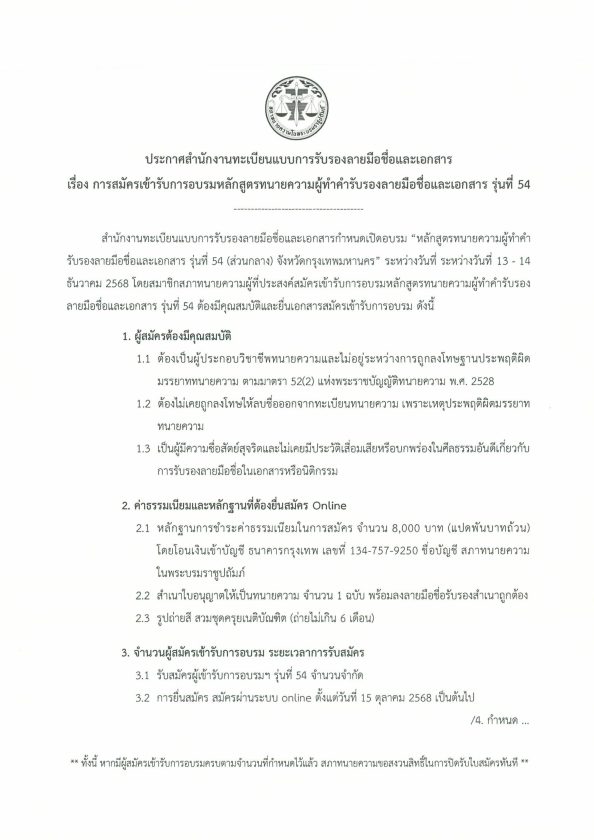 ประกาศสำนักงานทะเบียนแบบการรับรองลายมือชื่อและเอกสาร เรื่อง เปิดรับสมัคร “การอบรมหลักสูตรทนายความผู้ทำคำรับรองลายมือชื่อและเอกสาร” รุ่น 54
