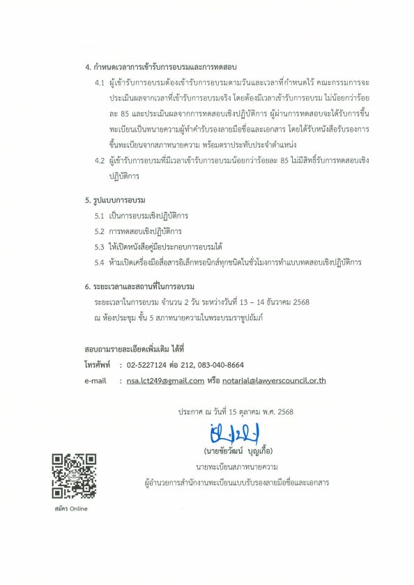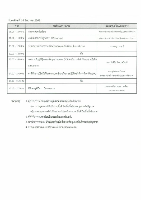 วันเวลาและสถานที่อบรม : วันเสาร์และอาทิตย์ที่ 13-14 ธันวาคม 2568 ณ ห้องประชุมชั้น 5 สภาทนายความในพระบรมราชูปถัมภ์ กรุงเทพมหานคร