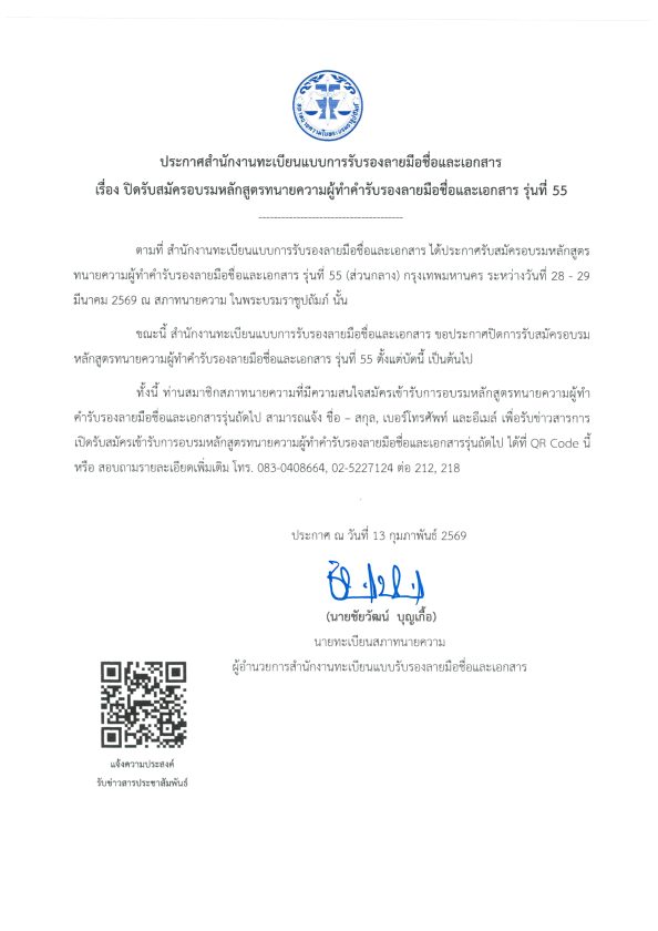 ประกาศสำนักงานทะเบียนแบบการรับรองลายมือชื่อและเอกสาร เรื่อง ปิดรับสมัครการอบรมหลักสูตรทนายความผู้ทำคำรับรองลายมือชื่อและเอกสาร รุ่น 55 13/02/2026Peerapongข่าวสภาทนายความ ประกาศสำนักงานทะเบียนแบบการรับรองลายมือชื่อและเอกสาร เรื่อง ปิดรับสมัครการอบรมหลักสูตรทนายความผู้ทำคำรับรองลายมือชื่อและเอกสาร รุ่น 55 FacebookFacebookXXLINELine