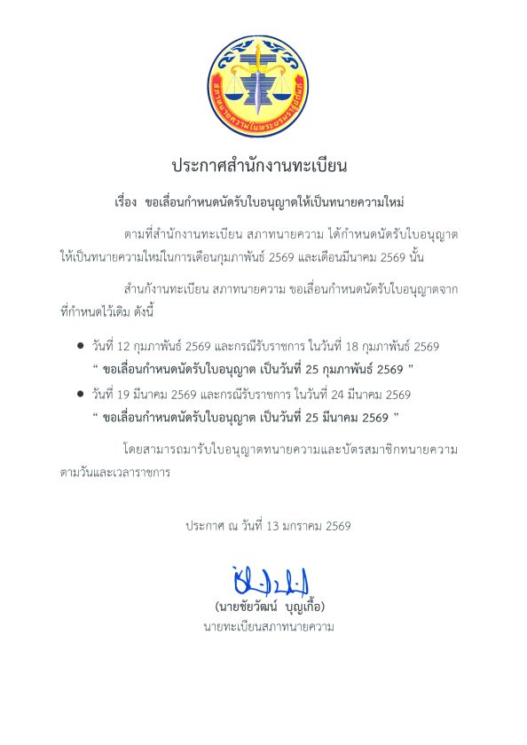 ประกาศสำนักงานทะเบียน เรื่อง ขอเลื่อนกำหนดนัดรับใบอนุญาตให้เป็นทนายความใหม่ 13/01/2026Peerapongข่าวสภาทนายความ ประกาศสำนักงานทะเบียน เรื่อง ขอเลื่อนกำหนดนัดรับใบอนุญาตให้เป็นทนายความใหม่ FacebookFacebookXXLINELine