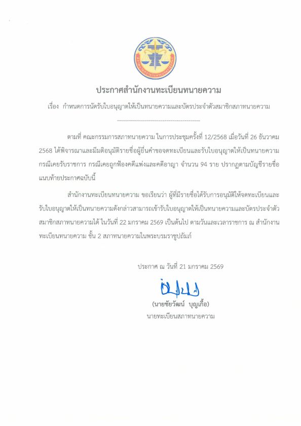 ประกาศสำนักงานทะเบียนทนายความ เรื่อง กำหนดนัดรับใบอนุญาตและบัตรสมาชิกสภาทนายความ