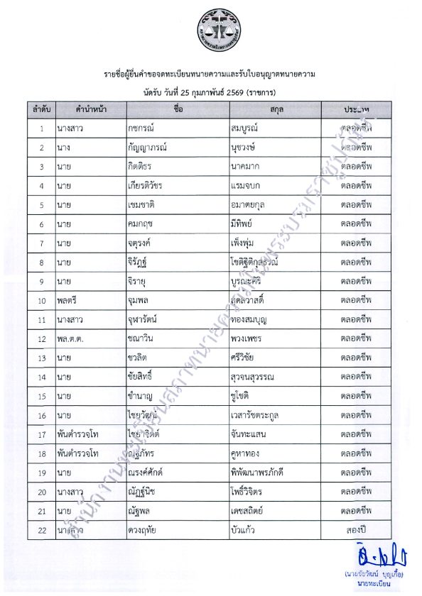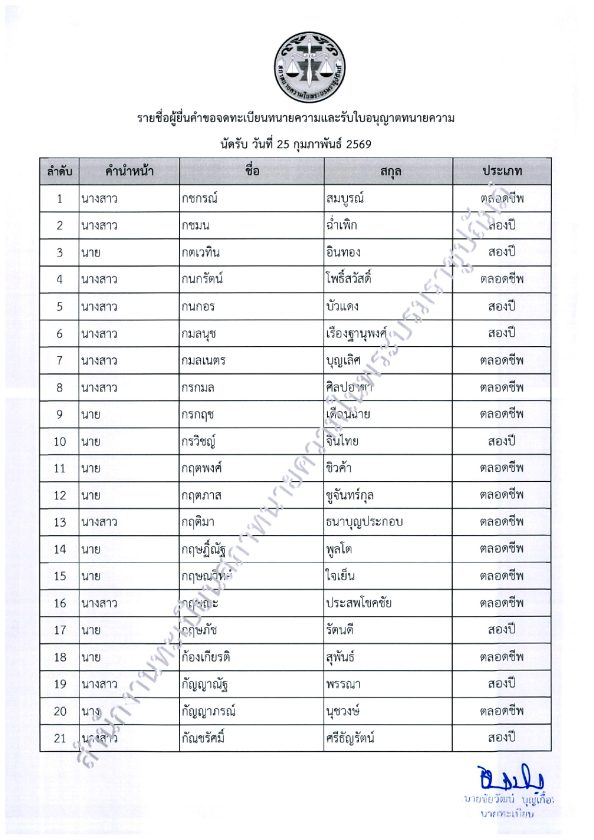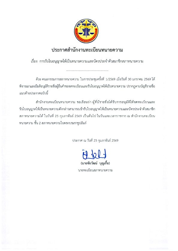 โดยประกาศรายชื่อผู้รับใบอนุญาตทนายความใหม่และกรณีรับราชการ นัดรับวันที่ 25 กุมภาพันธ์ 2569