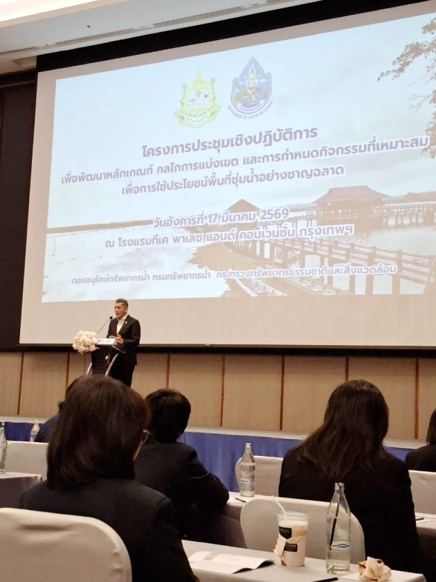 เมื่อวันที่ 17 มีนาคม 2569 เวลา 09.00 น. ณ ห้องประชุมไฮเดรนเยีย 2-3 โรงแรมทีเค พาเลช แอนด์ คอนเวนชั่น กรุงเทพมหานคร : กรมทรัพยากรน้ำ กระทรวงทรัพยากรธรรมชาติและสิ่งแวดล้อม ได้จัดการประชุมเชิงปฏิบัติการ เพื่อพัฒนาหลักเกณฑ์ กลไกการแบ่งเขต และการกำหนดกิจกรรมที่เหมาะสม เพื่อการใช้ประโยชน์พื้นที่ชุ่มน้ำอย่างชาญฉลาด โดย นายธีระชุณ บุญสิทธิ์ อธิบดีกรมทรัพยากรน้ำ เป็นประธานเปิดการประชุมฯ มีนางนันทวรรณ เหล่าฤทธิ์ ผู้อำนวยการส่วนบริหารจัดการพื้นที่ชุ่มน้ำ กรมทรัพยากรน้ำ เป็นวิทยากร ในการประชุมครั้งนี้ ดร.ธนพล คงเจี้ยง นายกสภาทนายความ มอบหมายให้นายวิชาญ ทองรัก อุปนายกฝ่ายปฏิบัติการ นายจรุงศักดิ์ ชะโกฏิ รองประธานกรรมการสิ่งแวดล้อม สภาทนายความ และนางสาวกานดามณี กุลวานิช กรรมการสิ่งแวดล้อม สภาทนายความ เข้าร่วมประชุม