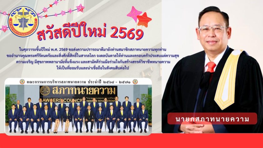 ในศุภวาระขึ้นปีใหม่ พ.ศ. 2569 ขอส่งความปรารถนาดีมายังท่านสมาชิกสภาทนายความทุกท่าน ขออำนาจคุณพระศรีรัตนตรัยและสิ่งศักดิ์สิทธิ์ในสากลโลก จงดลบันดาลให้ท่านและครอบครัวประสบแต่ความสุข ความเจริญ มีสุขภาพพลานามัยที่แข็งแรง และสามัคคีร่วมมือร่วมใจกันสร้างสรรค์วิชาชีพทนายความให้เป็นที่ยอมรับและน่าเชื่อถือในสังคมสืบต่อไป