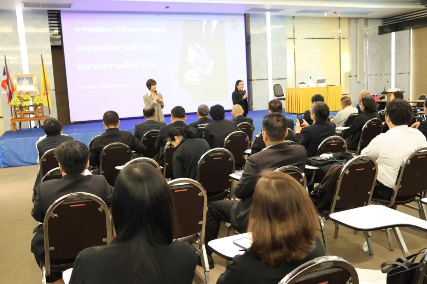จากนั้นในช่วงบ่ายเป็นการบรรยายในหัวข้อ “สื่อสารอย่างเฉียบคม : เทคนิคการพูดและเจรจาต่อรอง สำหรับทนายความยุคใหม่” การพูดที่ดีไม่ใช่แค่การสื่อสาร แต่คือการ สร้างความเชื่อมั่น และโน้มน้าวใจ เพื่อให้ทุกก้าวในอาชีพทนายความเป็นไปตามต้องการ โดย อาจารย์เปรมสุดา พรหมรักษา ผู้เชี่ยวชาญด้านการพัฒนาบุคลิกภาพและการพูด