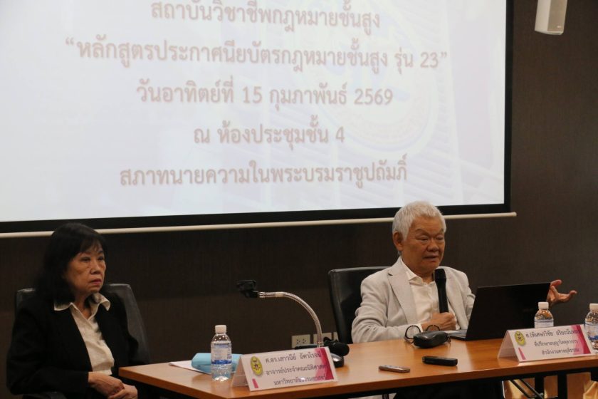 เมื่อวันอาทิตย์ที่ 15 กุมภาพันธ์ 2569 เวลา 09.00 – 16.30 น. ณ ห้องบรรยายชั้น 4 สภาทนายความในพระบรมราชูปถัมภ์ : สถาบันวิชาชีพกฎหมายชั้นสูง แห่งสภาทนายความ จัดอบรม “หลักสูตรทนายความที่ปรึกษากฎหมายชั้นสูง รุ่นที่ 23” โดยวันนี้ได้รับเกียรติจาก รศ.ดร.เอกบุญ วงศ์สวัสดิกุล อาจารย์ประจำคณะนิติศาสตร์ มหาวิทยาลัยธรรมศาสตร์ วิชา กฎหมายปกครอง บรรยายหัวข้อ กฎหมายความรับผิดทางละเมิดของเจ้าหน้าที่ และ ศ.(พิเศษ) วิชัย อริยะนันทกะ ศ.ดร.เสาวนีย์ อัศวโรจน์ วิชา กฎหมายอนุญาโตตุลาการ บรรยายหัวข้อ สัมมนาเชิงปฏิบัติการ แลกเปลี่ยนประสบการณ์ในการทำหน้าที่เป็นอนุญาโตตุลาการ รวมถึงนำเสนอประสบการณ์จากผู้ที่เคยทำหน้าที่เป็นอนุญาโตตุลาการในข้อพิพาทต่าง ๆ เช่น สัญญาร่วมทุนสัญญาก่อสร้าง สัญญาจ้างทำของ สัญญาซื้อขาย เพื่อแลกเปลี่ยนประสบการณ์
