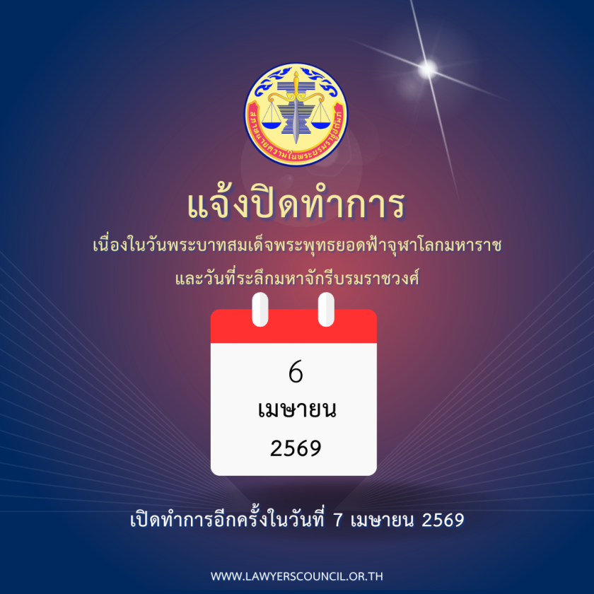 แจ้งปิดทำการ เนื่องในวันพระบาทสมเด็จพระพุทธยอดฟ้าจุฬาโลกมหาราชฯ 03/04/202625/03/2026Peerapongข่าวสภาทนายความ สภาทนายความในพระบรมราชูปถัมภ์ แจ้งปิดทำการ วันจันทร์ที่ 6 เมษายน 2569 เนื่องในวันพระบาทสมเด็จพระพุทธยอดฟ้าจุฬาโลกมหาราช และวันที่ระลึกมหาจักรีบรมราชวงศ์ FacebookFacebookXXLINELine