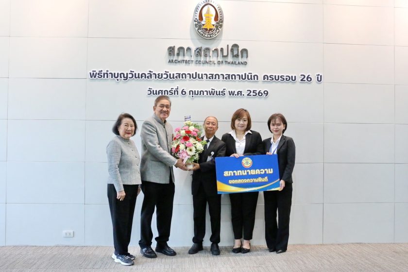 เมื่อวันศุกร์ที่ 6 กุมภาพันธ์ 2569 เวลา 10.00 น. ณ ห้องประชุม 301 ชั้น 3 อาคารสภาสถาปนิก : ดร.ธนพล คงเจี้ยง นายกสภาทนายความ มอบหมายให้นายณรงค์รัฐ ภูติรถยา อุปนายกฝ่ายบริหาร และนางสุพรรณี แก้วตา ผู้ช่วยหัวหน้าสำนักงานสภาทนายความ ร่วมเป็นเกียรติและมอบกระเช้าดอกไม้แสดงความยินดี เนื่องในโอกาสครบรอบวันสถาปนาสภาสถาปนิก ครบรอบ 26 ปี โดยมีนายประภากร วทานยกุล นายกสภาสถาปนิก เป็นผู้รับมอบและให้การต้อนรับ