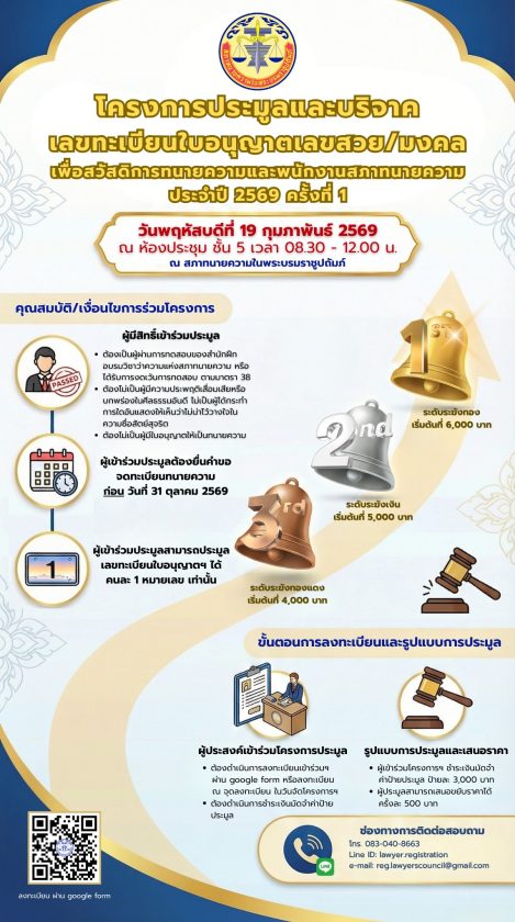 โครงการประมูลและบริจาคเลขทะเบียนใบอนุญาต เลขสวย/มงคล ประจำปี 2569 เพื่อสวัสดิการทนายความและพนักงานสภาทนายความ ประจำปี 2569 ครั้งที่ 1 ในวันพฤหัสบดีที่ 19 กุมภาพันธ์ 2569 เวลา 08.30 น. – 12.00 น. ณ ห้องประชุม ชั้น 5 สภาทนายความในพระบรมราชูปถัมภ์