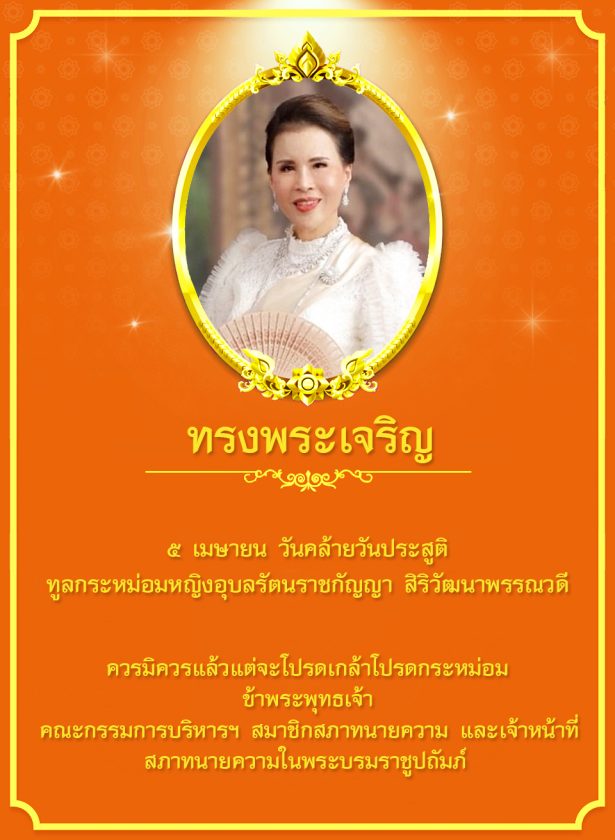 ๕ เมษายน ๒๕๖๙ วันคล้ายวันประสูติ ทูลกระหม่อมหญิงอุบลรัตนราชกัญญา สิริวัฒนาพรรณวดี 05/04/202605/04/2026Witchayaporn Suksriข่าวสภาทนายความ ขอพระองค์ทรงพระเจริญ ควรมิควรแล้วแต่จะโปรดเกล้าโปรดกระหม่อม ข้าพระพุทธเจ้า คณะกรรมการบริหารสภาทนายความ, สมาชิกสภาทนายความ และเจ้าหน้าที่สภาทนายความในพระบรมราชูปถัมภ์ FacebookFacebookXXLINELine
