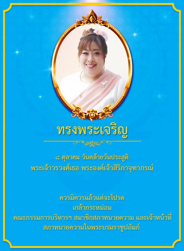 8 ตุลาคม วันคล้ายวันประสูติ พระเจ้าวรวงศ์เธอ พระองค์เจ้าสิริภาจุฑาภรณ์ 08/10/202508/10/2025Peerapongข่าวสภาทนายความ 8 ตุลาคม วันคล้ายวันประสูติ พระเจ้าวรวงศ์เธอ พระองค์เจ้าสิริภาจุฑาภรณ์ ขอพระองค์ทรงพระเจริญ ควรมิควรแล้วแต่จะโปรด เกล้ากระหม่อม คณะกรรมการบริหารสภาทนายความ สมาชิกสภาทนายความ และเจ้าหน้าที่ สภาทนายความในพระบรมราชูปถัมภ์ FacebookFacebookXXLINELine