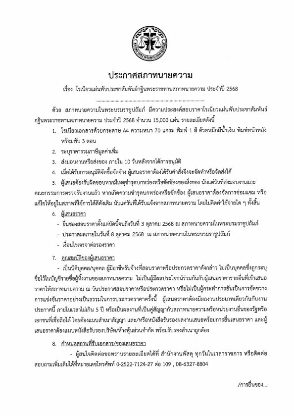 ประกาศสภาทนายความ เรื่อง โรเนียวแผ่นพับประชาสัมพันธ์กฐินพระราชทานสภาทนายความ ประจำปี 2568 30/09/2025Peerapongประกาศจัดซื้อจัดจ้าง ประกาศสภาทนายความ เรื่อง โรเนียวแผ่นพับประชาสัมพันธ์กฐินพระราชทานสภาทนายความ ประจำปี 2568 ดาวน์โหลดใบประกาศ : Download FacebookFacebookXXLINELine
