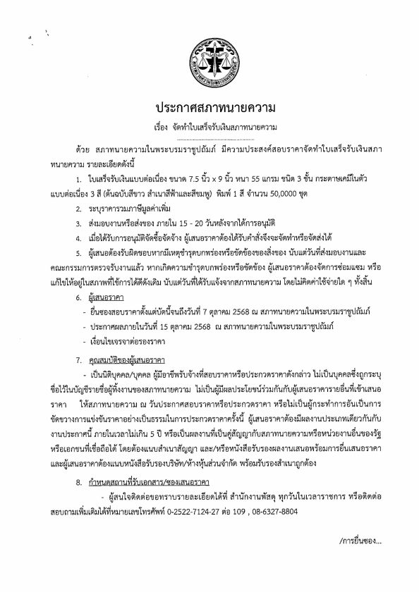 ประกาศสภาทนายความ เรื่อง จัดทำใบเสร็จรับเงินสภาทนายความ 02/10/202502/10/2025Peerapongประกาศจัดซื้อจัดจ้าง ประกาศสภาทนายความ เรื่อง จัดทำใบเสร็จรับเงินสภาทนายความ ดาวน์โหลดใบประกาศ : Download FacebookFacebookXXLINELine