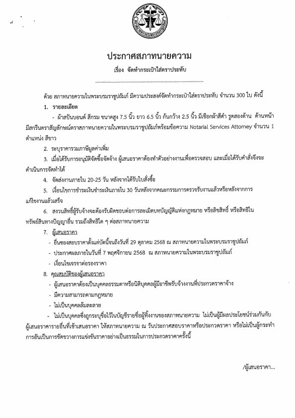 ประกาศสภาทนายความ เรื่อง จัดทำกระเป๋าใส่ตราประทับ 22/10/2025Peerapongประกาศจัดซื้อจัดจ้าง ประกาศสภาทนายความ เรื่อง จัดทำกระเป๋าใส่ตราประทับ ดาวน์โหลดใบประกาศ : Download FacebookFacebookXXLINELine