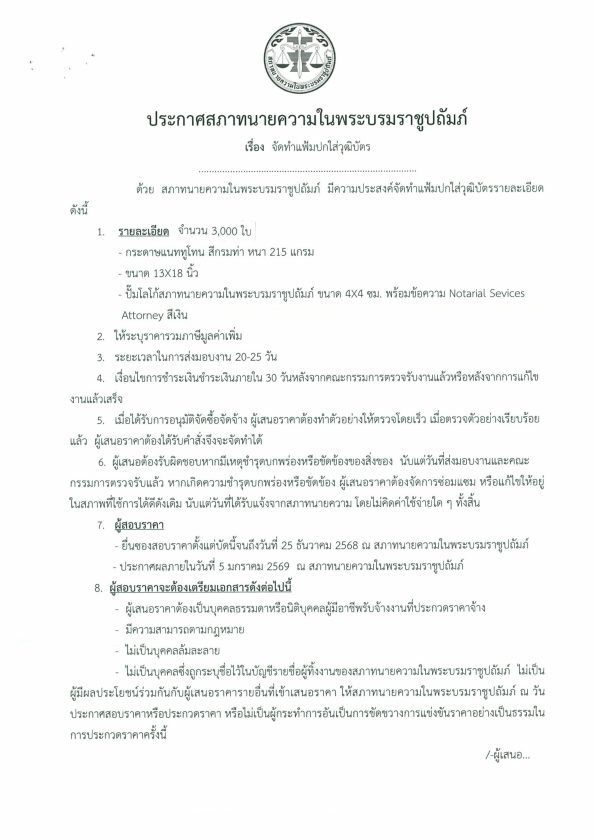 ประกาศสภาทนายความ เรื่อง จัดทำแฟ้มปกใส่วุฒิบัตร 19/12/2025Peerapongประกาศจัดซื้อจัดจ้าง ประกาศสภาทนายความ เรื่อง จัดทำแฟ้มปกใส่วุฒิบัตร ดาวน์โหลดใบประกาศ : Download FacebookFacebookXXLINELine