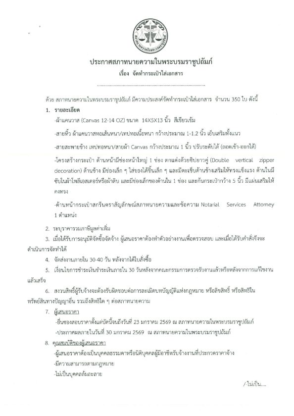 ประกาศสภาทนายความ เรื่อง จัดทำกระเป๋าใส่เอกสาร 16/01/2026Peerapongประกาศจัดซื้อจัดจ้าง ประกาศสภาทนายความ เรื่อง จัดทำกระเป๋าใส่เอกสาร ดาวน์โหลดใบประกาศ : Download FacebookFacebookXXLINELine