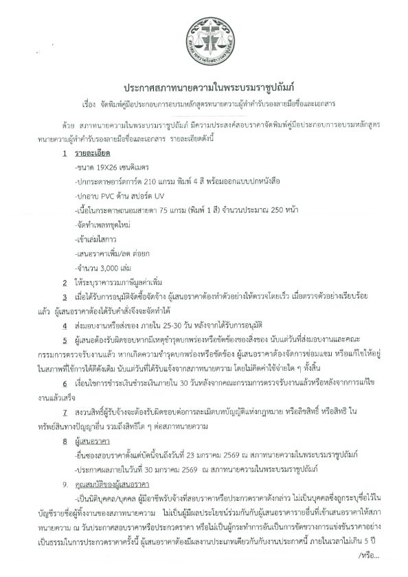 ประกาศสภาทนายความ เรื่อง จัดพิมพ์คู่มือประกอบการอบรมหลักสูตรทนายความผู้ทำคำรับรองลายมือชื่อและเอกสาร 16/01/2026Peerapongประกาศจัดซื้อจัดจ้าง ประกาศสภาทนายความ เรื่อง จัดพิมพ์คู่มือประกอบการอบรมหลักสูตรทนายความผู้ทำคำรับรองลายมือชื่อและเอกสาร ดาวน์โหลดใบประกาศ : Download FacebookFacebookXXLINELine