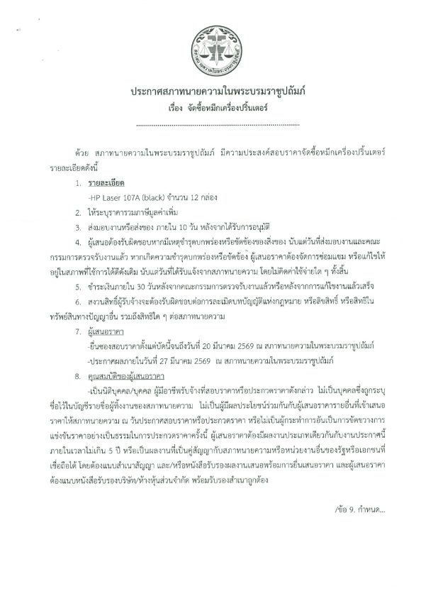 ประกาศสภาทนายความ เรื่อง จัดซื้อหมึกเครื่องปริ้นเตอร์ 16/03/2026Peerapongประกาศจัดซื้อจัดจ้าง ประกาศสภาทนายความ เรื่อง จัดซื้อหมึกเครื่องปริ้นเตอร์ ดาวน์โหลดใบประกาศ : Download FacebookFacebookXXLINELine