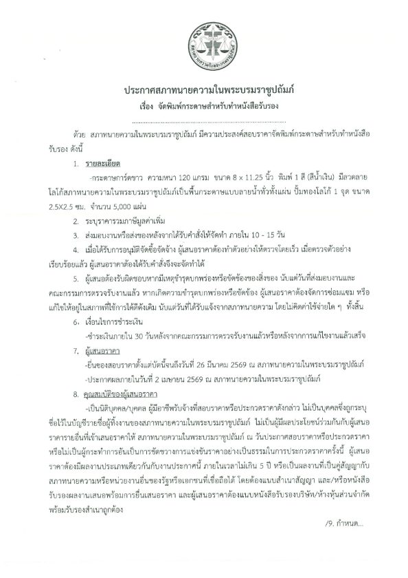 ประกาศสภาทนายความ เรื่อง จัดพิมพ์กระดาษสำหรับทำหนังสือรับรอง 19/03/2026Peerapongประกาศจัดซื้อจัดจ้าง ประกาศสภาทนายความ เรื่อง จัดพิมพ์กระดาษสำหรับทำหนังสือรับรอง ดาวน์โหลดใบประกาศ : Download FacebookFacebookXXLINELine