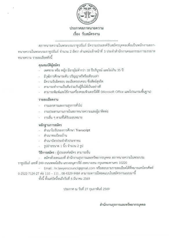สภาทนายความ เปิดรับสมัครพนักงาน