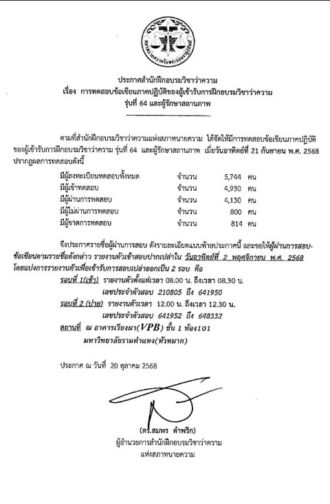 สถานที่ ณ มหาวิทยาลัยรามคำแหง (หัวหมาก) อาคาร เวียงผา (VPB) และให้ผู้เข้ารับการสอบปากเปล่าแต่งกายตามระเบียบและวิธีการตามที่สำนักฝึกอบรมวิชาว่าความกำหนด